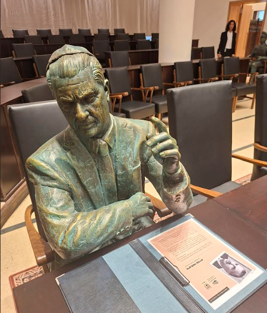 פסלו של השר חיים משה שפירא, באולם המשוחזר של מליאת הכנסת בבית פרומין, על הכסא עליו ישב. צילם: חגי הוברמן